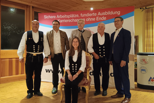 V.l. : Obermeister der Zimmerer-Innung Erding Georg Lippacher, Vizepräsident der Handwerkskammer Markus Haßelbeck, 3. Landrat Erding Rainer Mehringer, Anton Anzinger von der Zimmerei Anzinger, Eitting, Kreishandwerksmeister Rudi Waxenberger; sitzend: Franziska Anzinger (Innungsbeste).